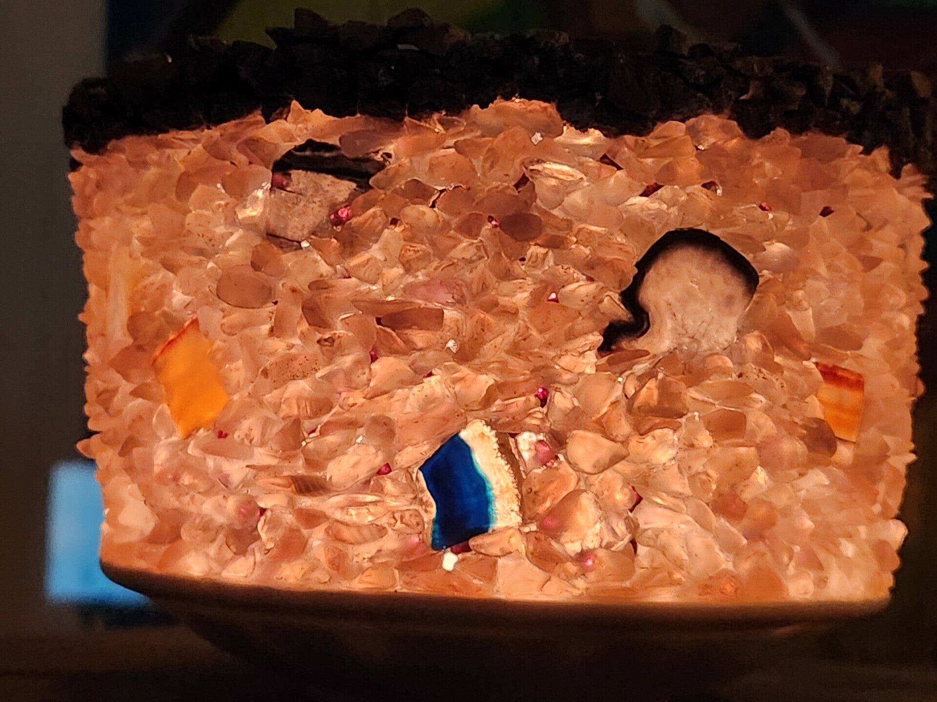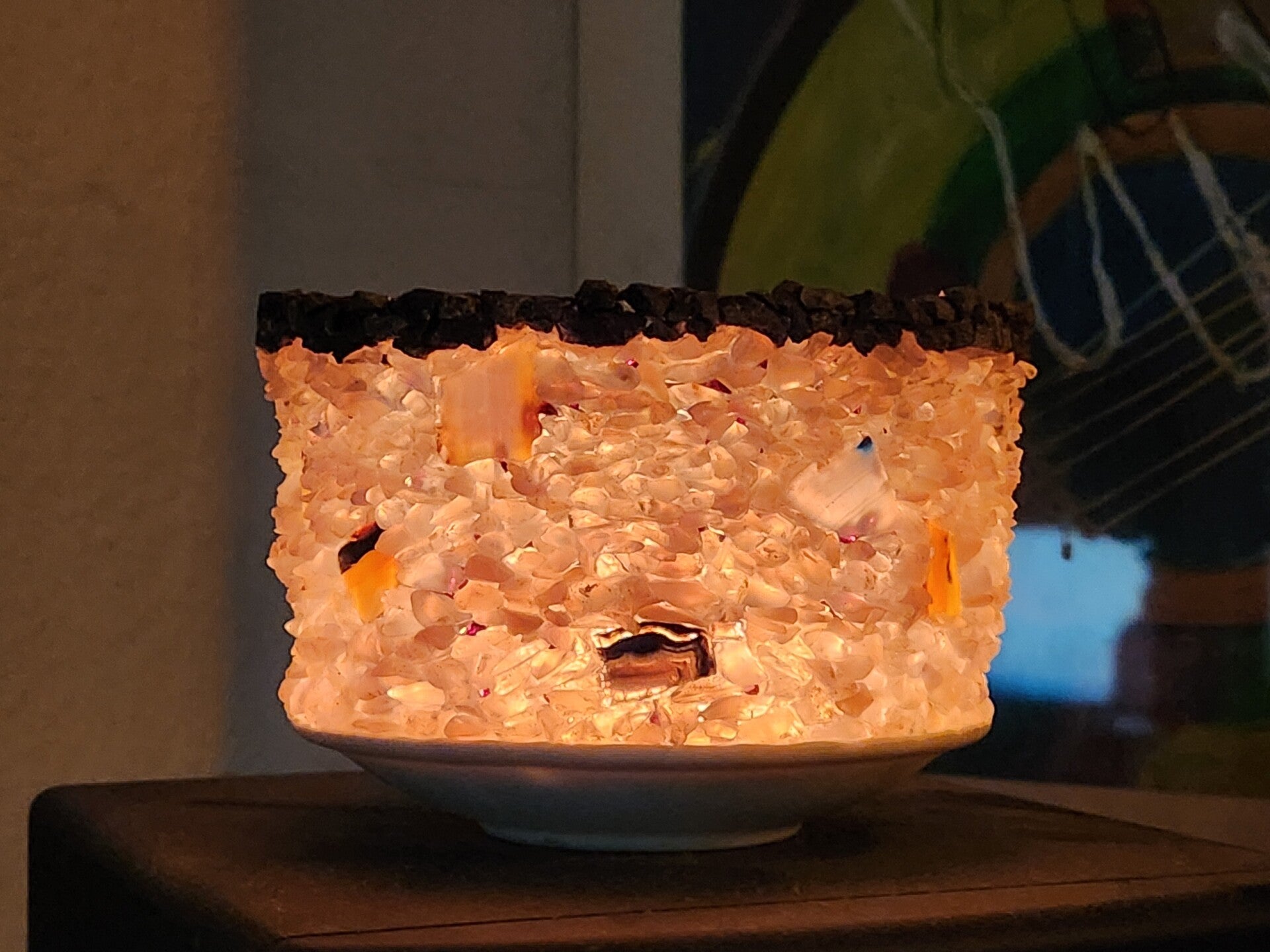 Eine Lampe aus sehr vielen Stunden der Geduld und Konzentration auf die winzig kleinen Achatsteine. Daher auch der Name für dieses schöne Stück. Durch das warme Licht bietet diese Lampe ein eigenes schönes Ambiente. Eine meditative Atmosphäre entsteht besonders in den Abendstunden.