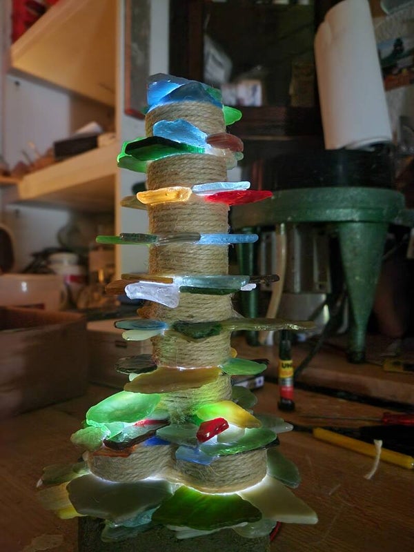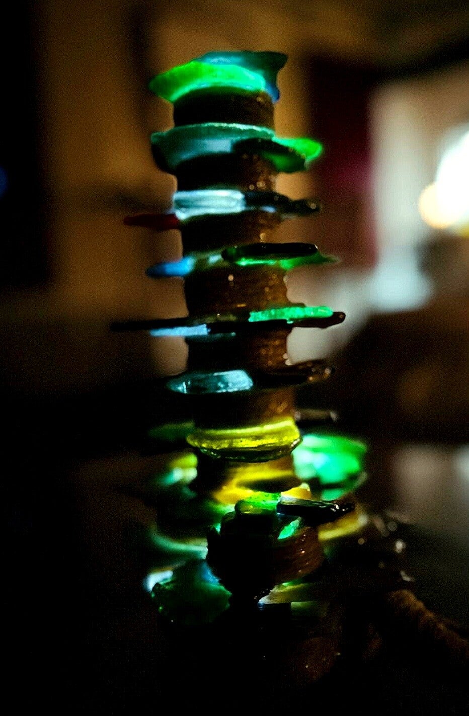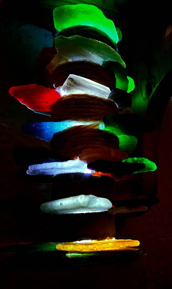 Diese Lampe funktioniert elektrisch mit Batterien (Handelsübliche 🔋). Die Leuchtdioden sind im Inneren der Lampe mittig angeordnet, so dass die Glasscherben nach außen leuchten.